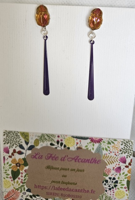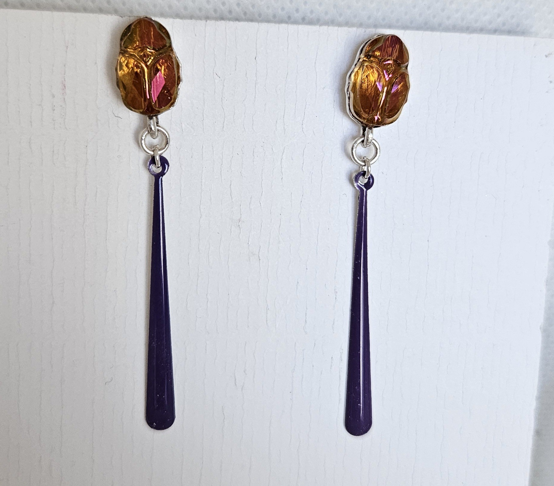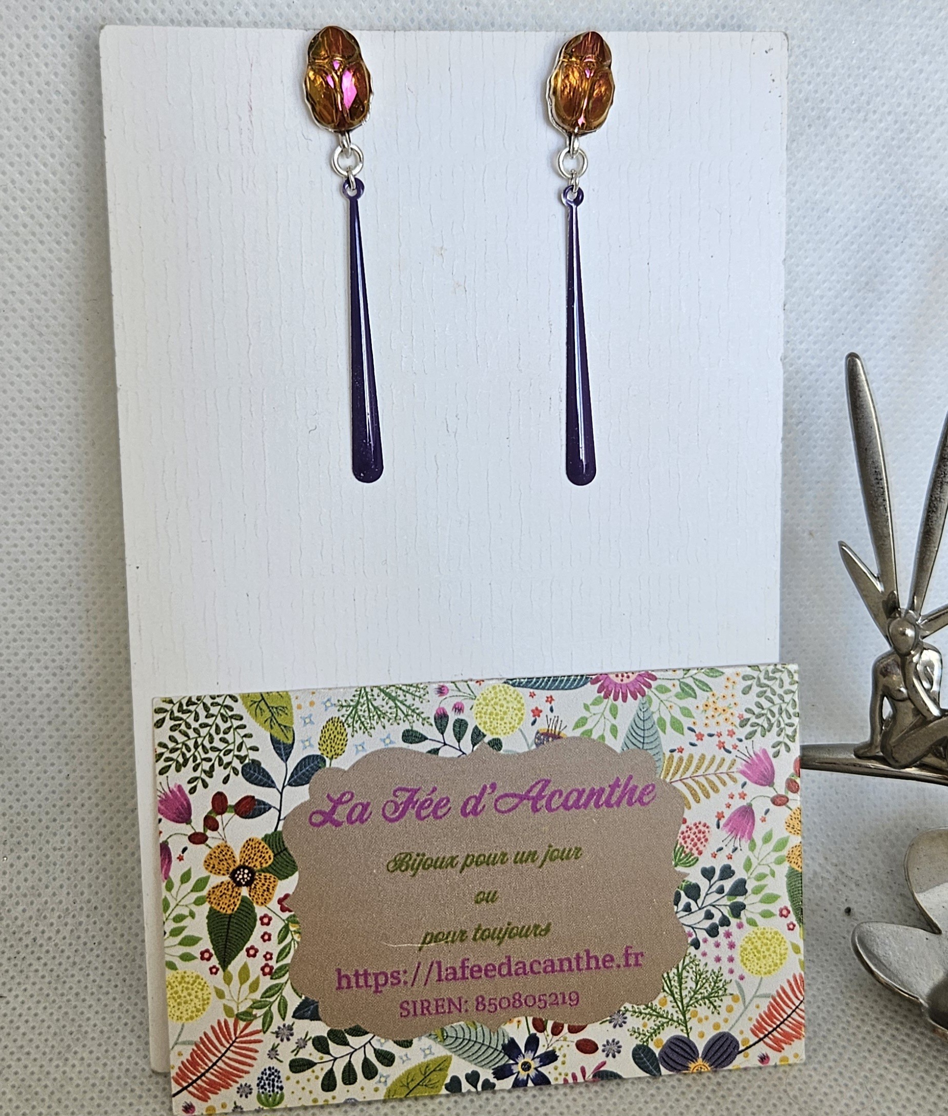 Boucle d'oreille pendante scarabée Swarovski orange brun , reflet violet , larme violette , fait main, argent 925