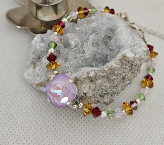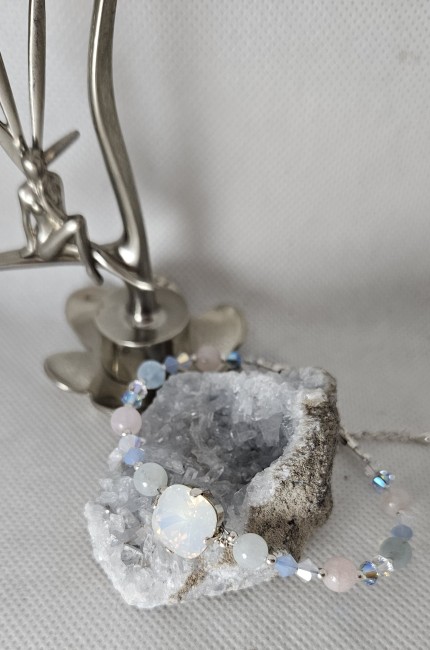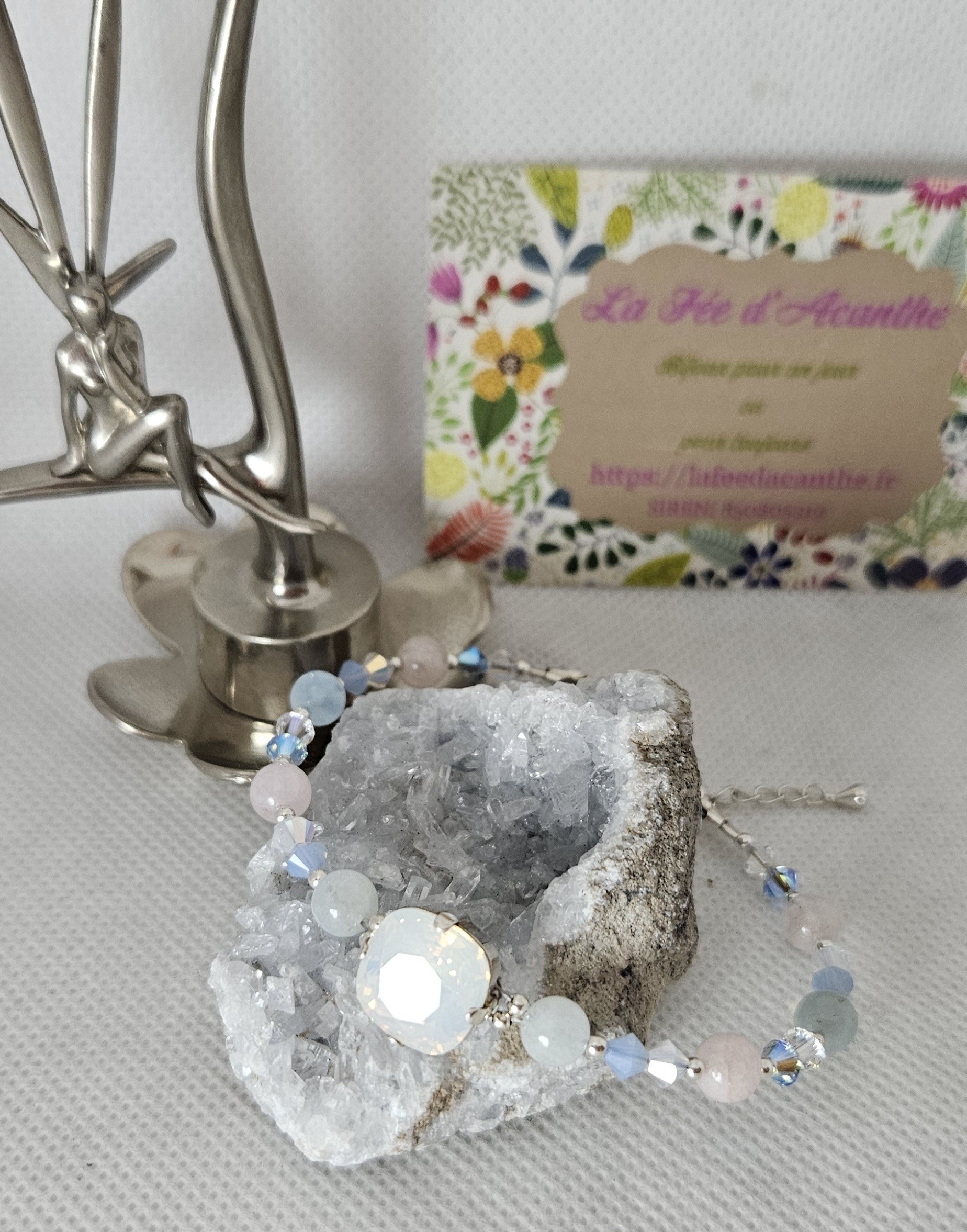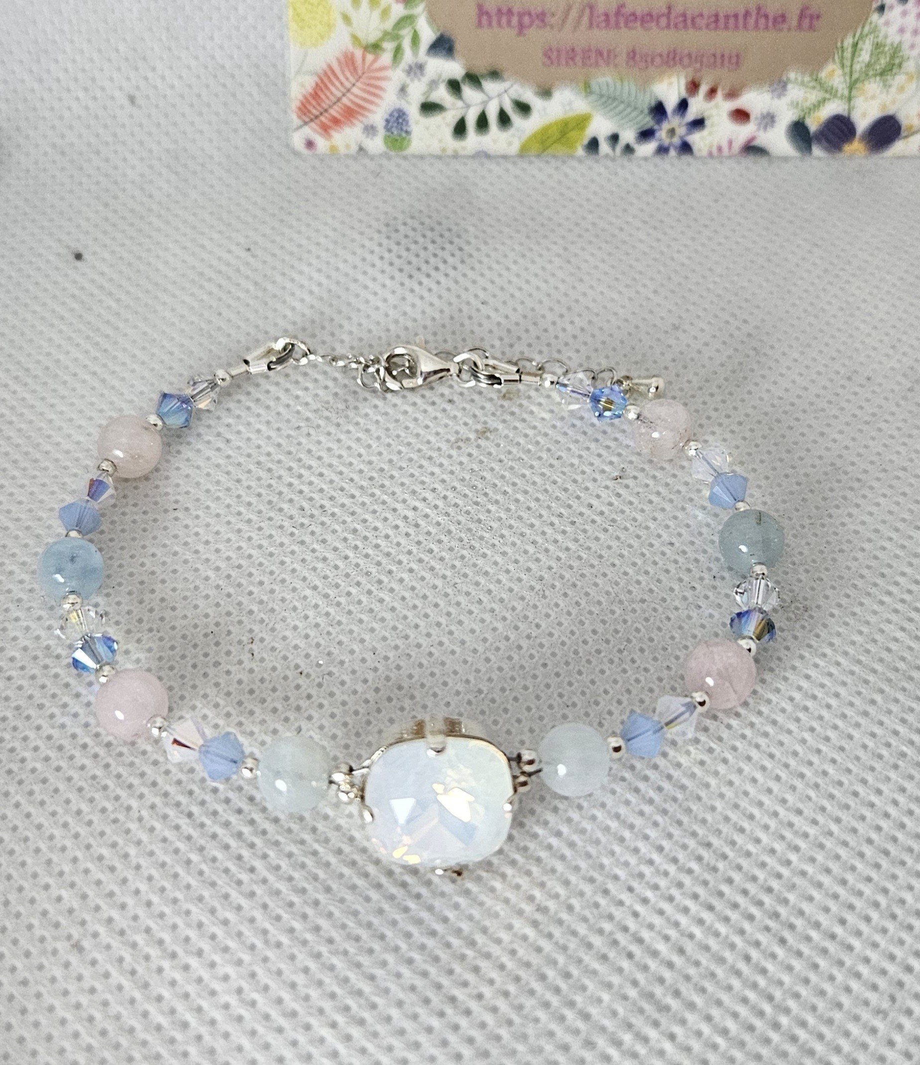 Bracelet cabochon swarovski blanc lune , perles argent 925, perles en verre pastel rose et bleu, réglable avec sa chaine d'extension , fait main, créatrice, modèle unique