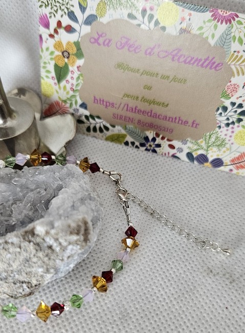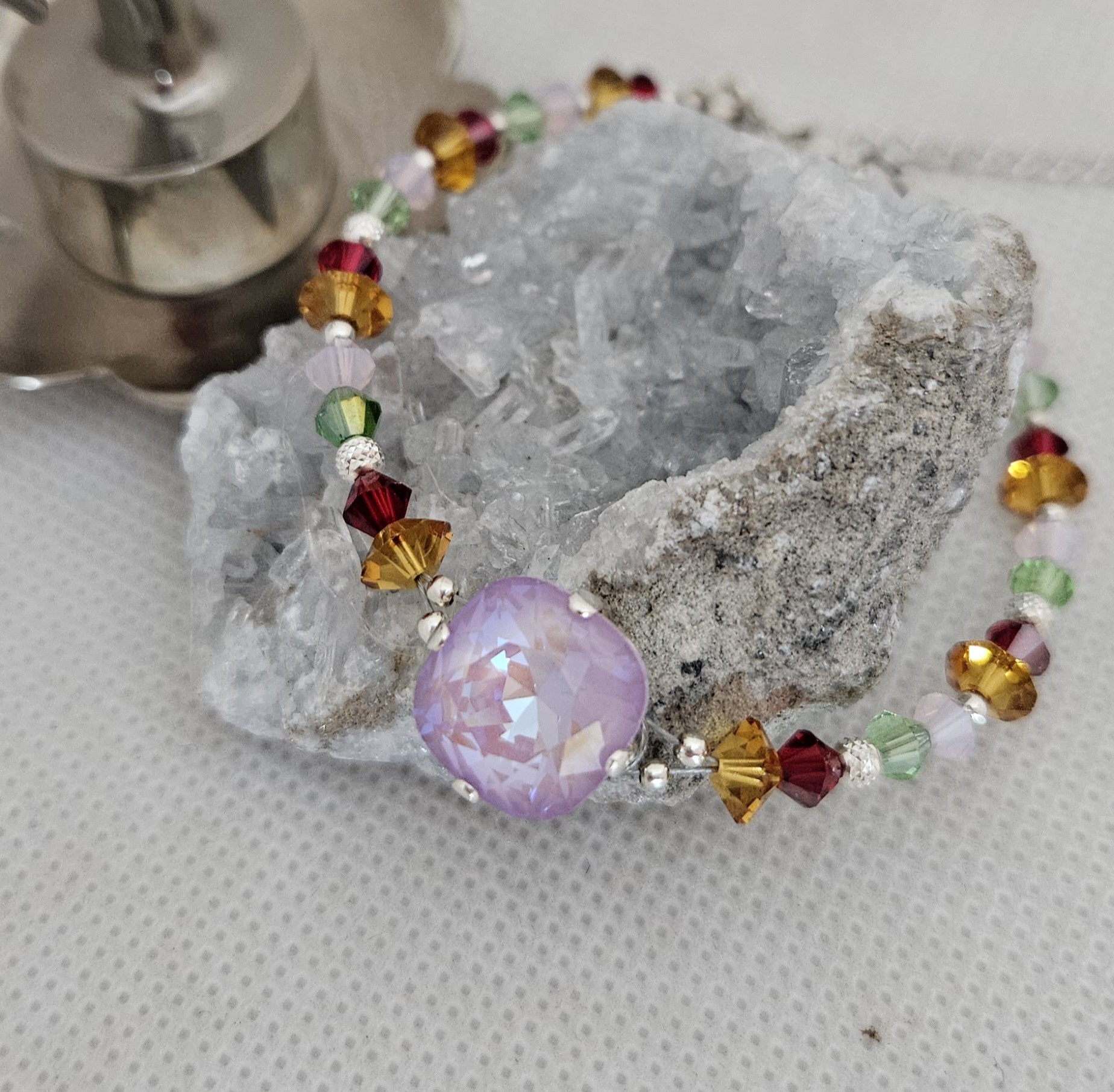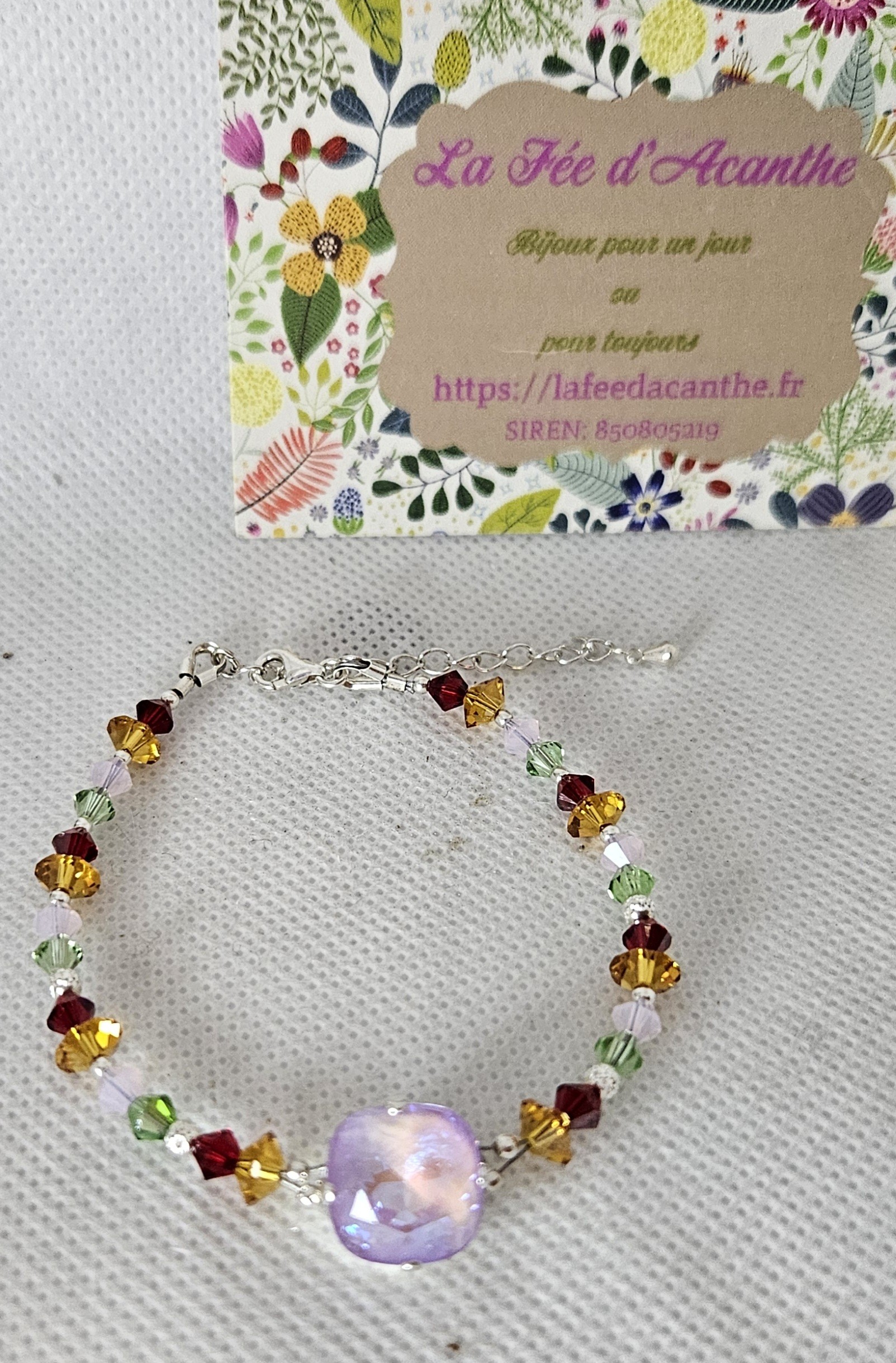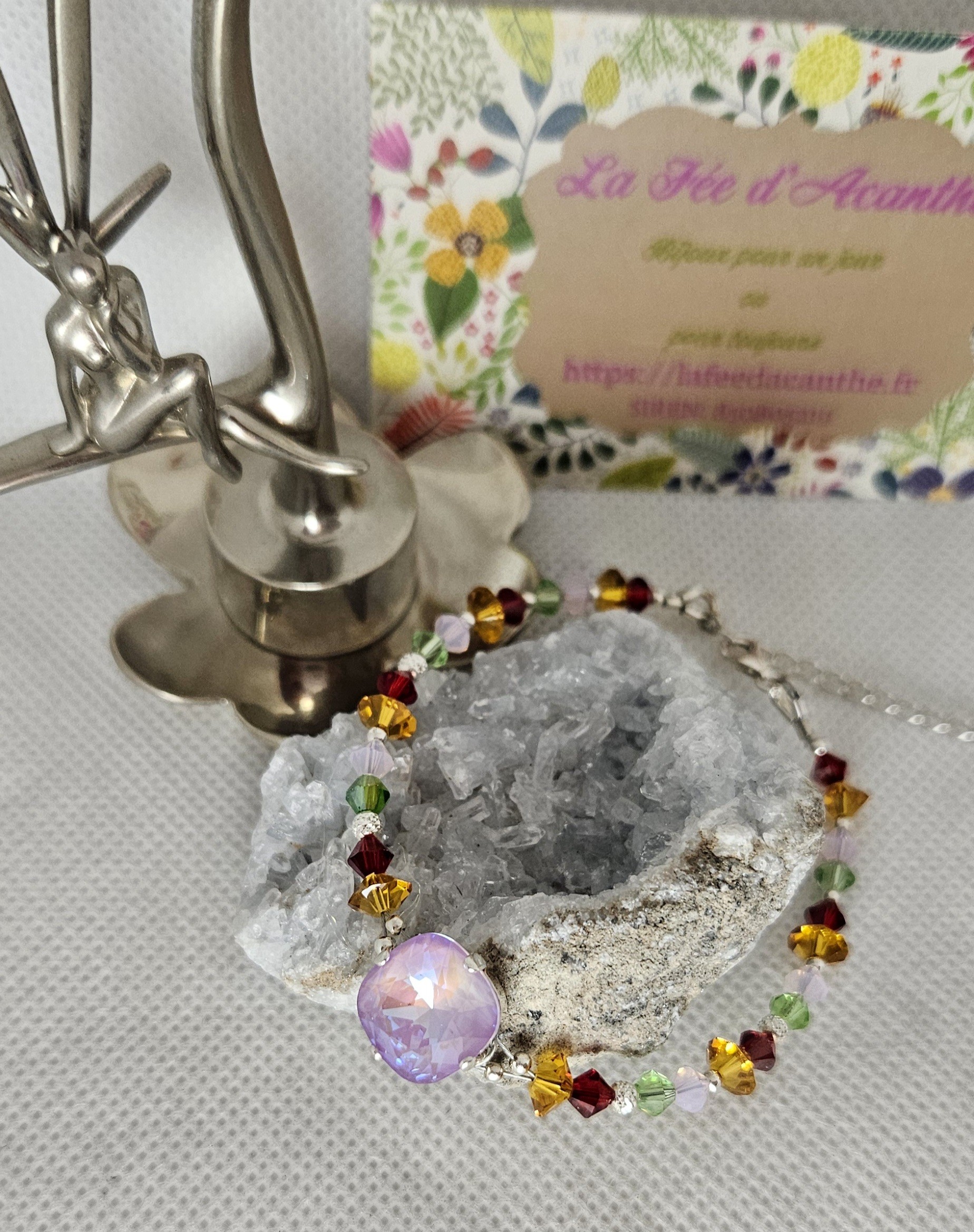 Bracelet cabochon swarovski rose parme , perles argent 925, perles colorées toupies swarovski , réglable, chaine d'extension en argent 925 , fait main, créatrice, modèle unique